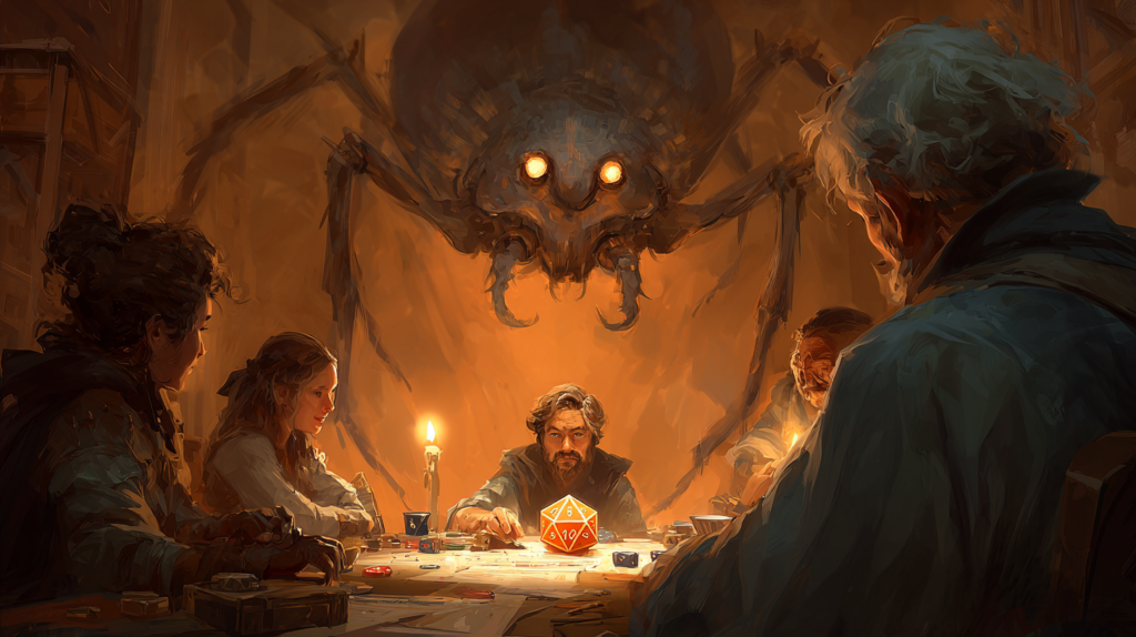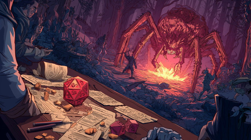 Before you can even look up, a giant, hairy spider as big as a large dog drops down from the shadows and lands on the rocky floor right in front of your group! Its eight eyes glow, and it lets out a hiss.”