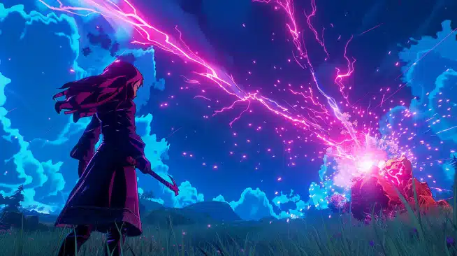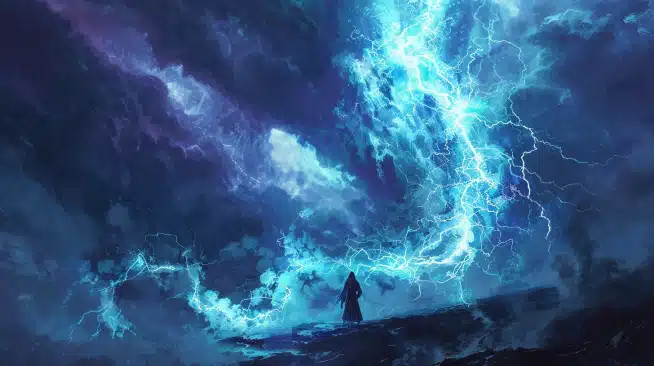 Imagine you’re a wizard with a wand, and when you say the magic words, a bright blue bolt of lightning zaps out and sticks to something, like a dragon or a giant rock. This isn’t just a quick flash; it’s a special kind of lightning that stays and keeps zapping as long as you keep your wand up and your focus sharp.